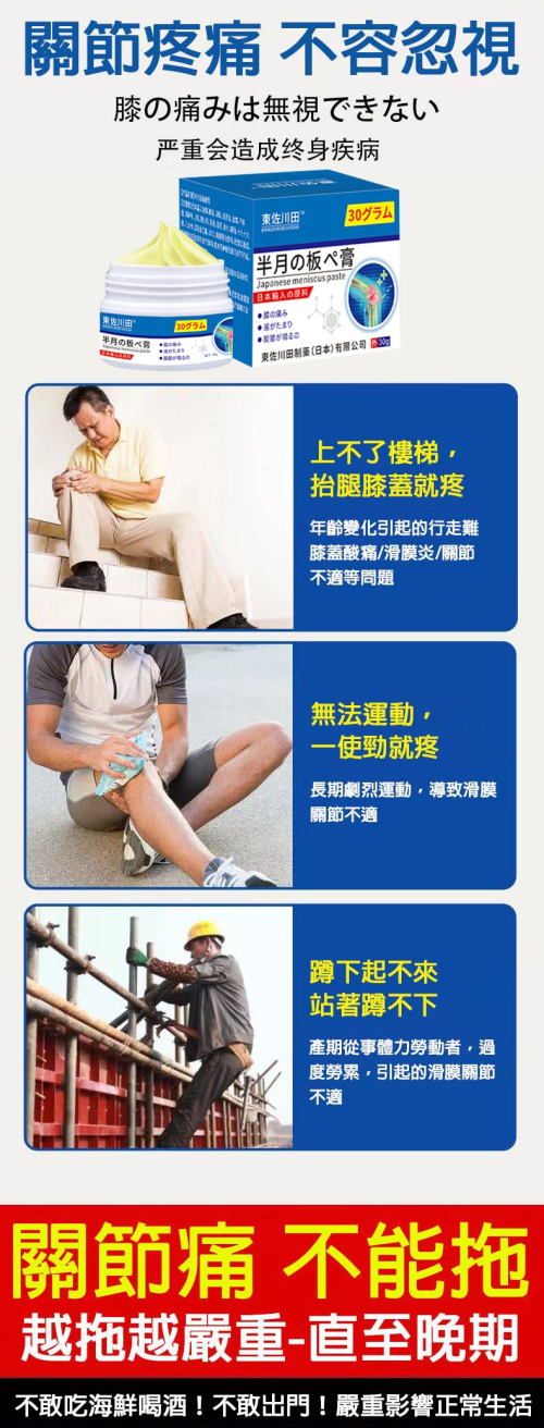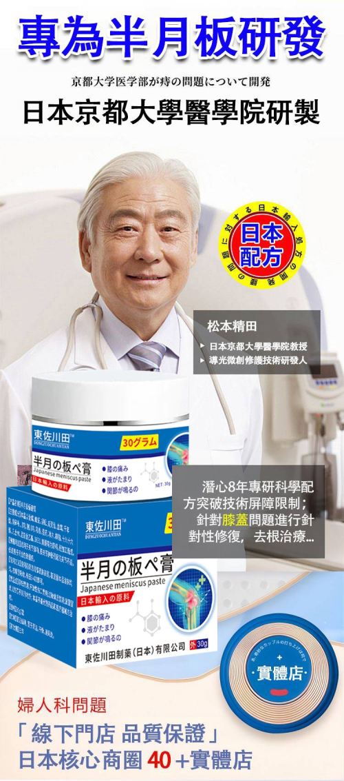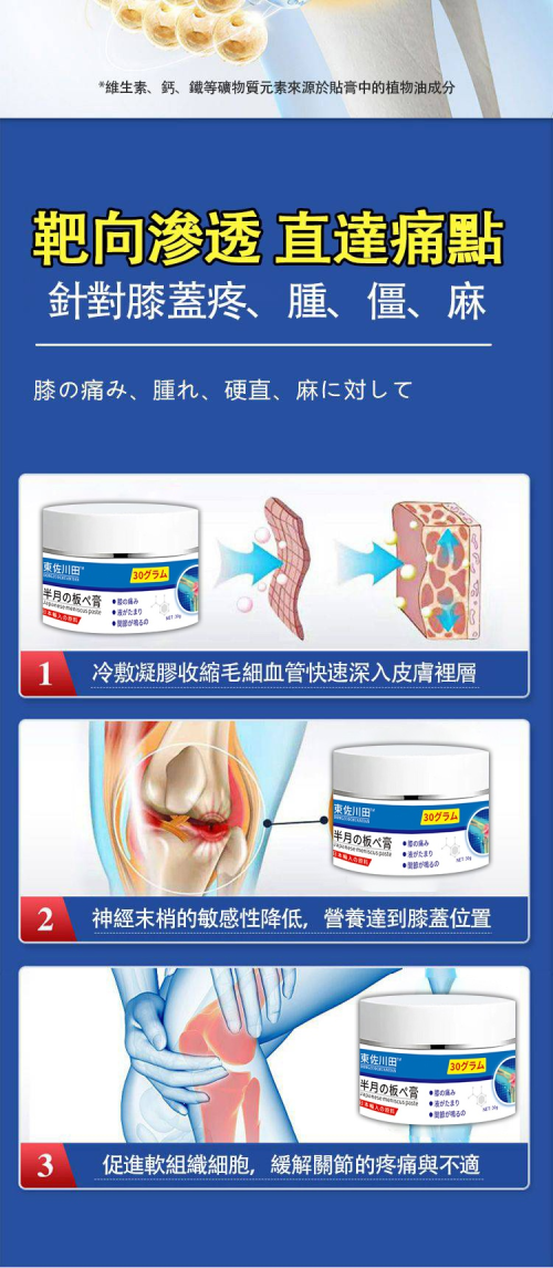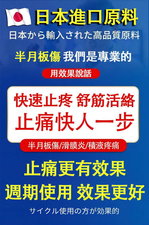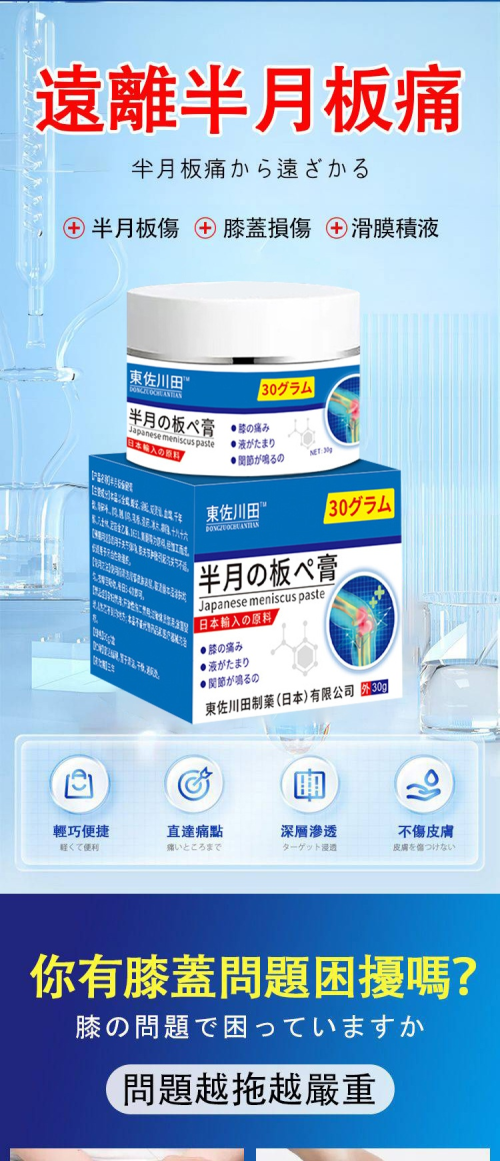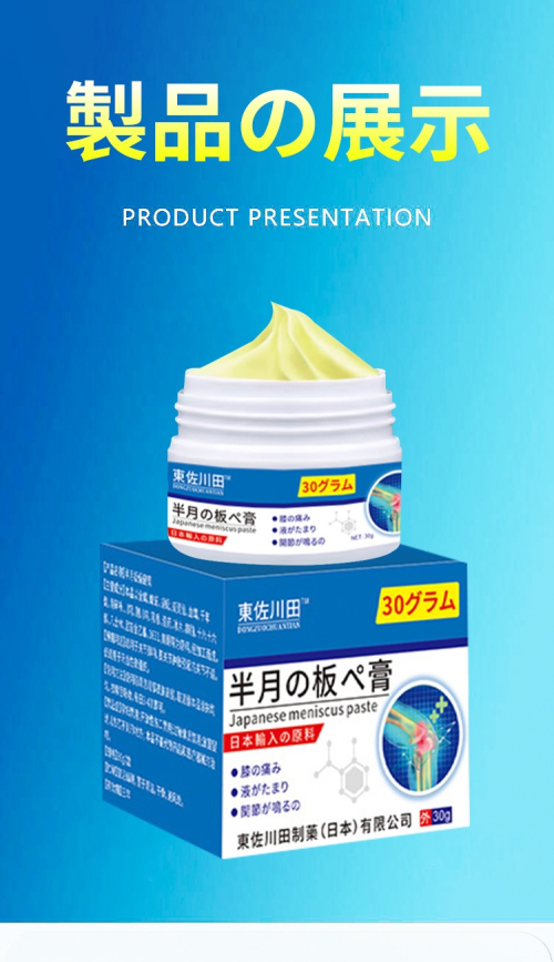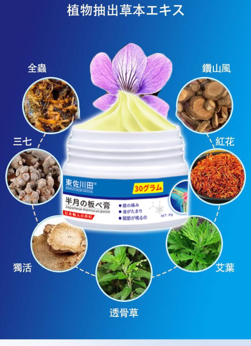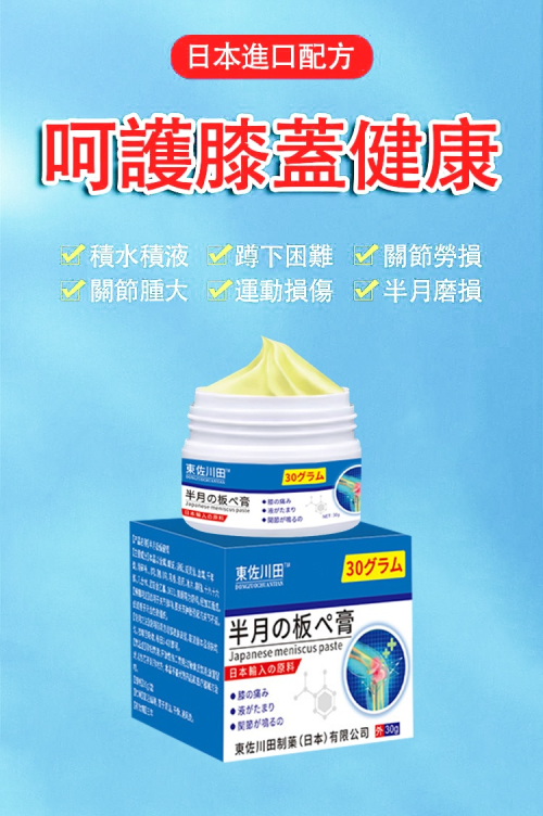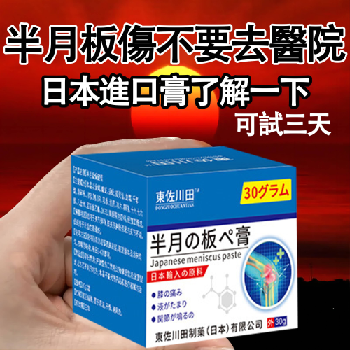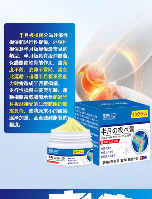 日本進口的東佐川田半月板藥膏為滑膜半月板損傷專用治療膝蓋半月板損傷疼痛、滑膜炎、滑膜積液、膝關節腫脹、關節疼痛的消炎止痛膏推薦。半月板膏為草本成分,溫和不刺激,每晚一次,深層滋養,除跟斷根。